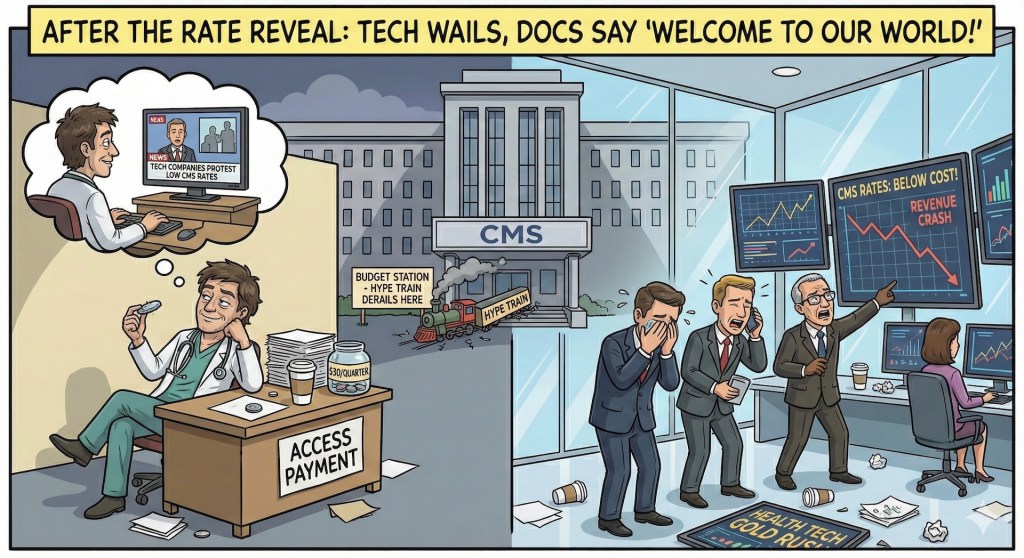 Healthtech, once high-fiving over outcome-aligned payments, now wails like toddlers denied candy. “These rates are below cost! We can’t afford our fancy apps and devices!” Cry me a river, folks—turns out $360-$420 a year per patient ain’t the gold rush.